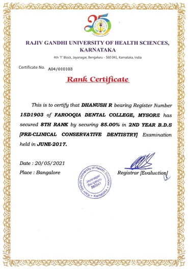 Rank certificate: 8th Rank in 2nd year BDS (Pre-Clinical Conservative Dentistry) June 2017